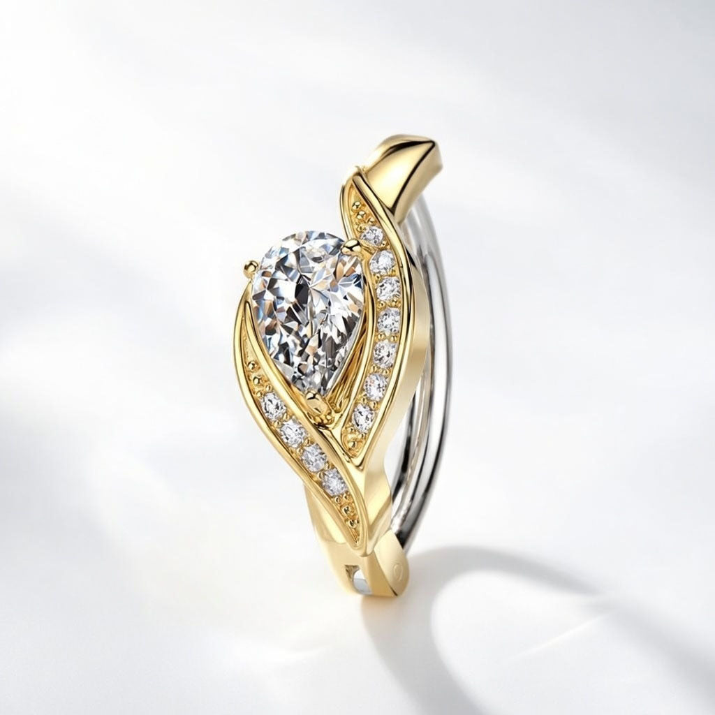 El diseño único en la parte delantera, donde dos líneas de circonitas blancas se curvan para enmarcar la gota de cristal, añade volumen a la joya.